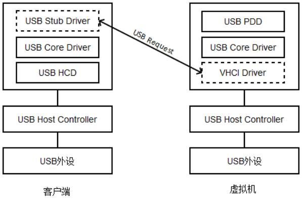 USB over TCP/IP的一般实现如图9-1所示,其中PDD为具体的USB外设驱动(Peripheral Device Driver),HCD为USB控制器驱动(Host Controller Driver),Stub Driver为客户端USB外设的统一驱动,VHCI Driver为虚拟机中的USB控制器驱动。当客户端插入USB外设时,系统会对其使用Stub驱动,设备重定向后USB请求与数据会被Stub驱动封装,经由TCP/IP传递至虚拟机的VHCI驱动,反过来亦如此。
