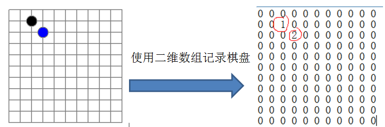 //创建一个原始的二维数组11*11,其中0表示没有棋子,1表示黑色棋子,2表示蓝色棋子