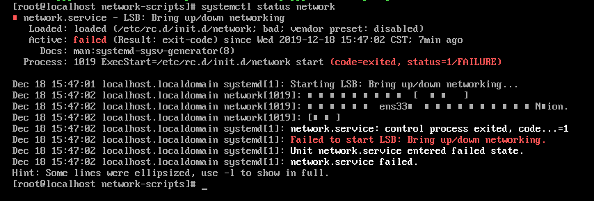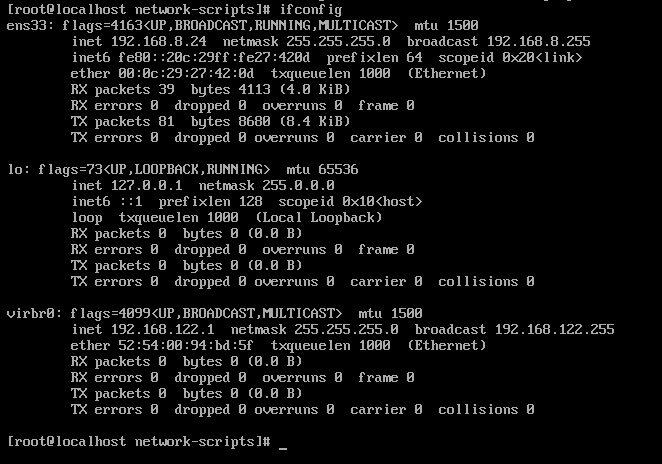 可以看到我们的网卡没有起来。一般网卡配置文件所在的目录为:/etc/sysconfig/network-scripts/ifcfg-xxx,我这里是ifcfg-ens33