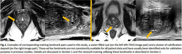 在这项工作中,我们着重于介入性多模态图像配准的一个应用范例,即将pre-procedural多参数磁共振(MR)图像配准到前列腺癌患者的intra-procedural经直肠超声(TRUS)图像中(Pinto et al.,2011;Rastinehad et al., 2014;Siddiqui et al., 2015)。多参数磁共振成像(Dickinson et al., 2011),包括超极化成像的最新发展(Wilson和Kurhanewicz, 2014)和基于扩散加权成像的计算方法(Panagiotaki et al., 2015),在诊断和演示方面显示出良好的结果。在包括英国在内的一些国家,这已经被推荐为标准临床路径的一部分(Vargas et al., 2016)。在intra-procedural方面,TRUS成像通常用于指导大多数靶向活检和局部治疗,但它在区分癌组织和健康环境方面的价值是有限。融合MR和TRUS图像,可以在TRUS-guided过程中对低至中等风险疾病可以准确的检测、定位和治疗(Valerio et al., 2015)。然而,像大多数其他超声引导的医疗处理,这代表了在没有鲁棒的图像相似性度量上,已被证明一个典型的例子。例如,在解剖学上不同的成像结构,如前列腺inner-outer腺分离、解理面称为外科包膜,定义在TRUS上的图像(Ethan j .Halpern 2008)和在MR图像上可以看到中心边缘的带状边界,在两种类型的图像中表现出相似的特征,因此具有很强的统计相关性。这将导致使用大多数(不是全部)建立的基于强度的相似性度量和相关的配准方法的错误对齐。(Rueckert et al., 1999)。