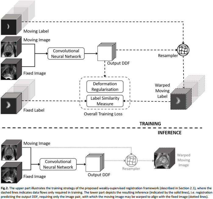 我们总结了图2所示框架的几个优点。首先,计算moving标签形变与fixed标签之间的模态无关的相似度,两者都不作为网络的输入。因此,在推理阶段,即实际配准阶段,并不需要它们。第二,不同类型的标签样本可以被喂给训练,而不需要一致的数量或类型被标记的解剖结构;而且每个图像对可能使用非常多的标签,而不会增加内存使用量。第三,moving和fixed图像是神经网络的唯一输入,不需要定义一个显式的基于强度的图像相似度度量,该度量必须针对不同的模态对进行裁剪。匹配强度模式将被训练为优化潜在标签对应的网络学习。第四,可以加入不同的正则化项,如弯曲能(Rueckert et al., 1999),L1- or位移梯度的L2范数(Fischer和Modersitzki, 2004; Kumar and Dass,2009; Vishnevskiy et al., 2017),附加为网络架构的约束。