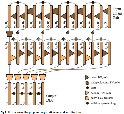 见我们的初步工作(Hu et al., 2018), 一个全局子网络预测一个仿射变换可以结合共同训练局部子网络预测 局部DDF,为了克服实际困难的传播形变的梯度规范少的支持标签数据。在这项工作中,我们描述了一个新的架构,利用一个单一的网络预测在和不同的分辨率水平上来位移求和。较低级别的位移总和提供了全局信息,与全局子网络的信息类似,但是全局子网络没有大量的内存使用。这些方法将在第3.2节中进行比较。