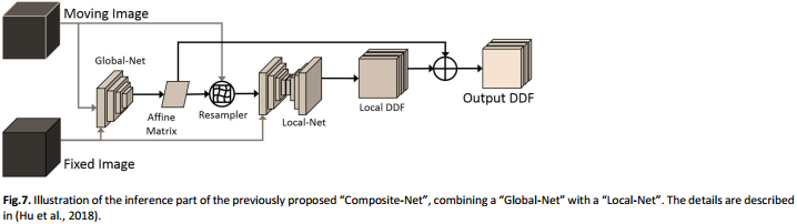 提出了如图6所示的“ Global-Net”,以使用相同的学习框架预测仿射变换详见第2.1节。提出了一个“Composite-Net”来组成“Global-Net”和“LocalNet”的输出DDF,如图7所示。 (Hu et al,. 2018)中描述了比较的“ Global-Net”和“ Composite-Net”的详细信息。由于数据集和相关的培训策略的差异,直接与先前报告的数值结果进行比较可能是不公平的。例如,本文报道的结果基于实质上更多的解剖学标记由第二个观察者(在第3.1节中进行了说明)进行了验证,但没有使用频率较低的“低置信度”标签(Hu et al., 2018)。为了直接比较不同的网络体系结构,使用与“Baseline”网络相同的多尺度Dice对“ Global-Net”和“ CompositeNet”进行了重新训练,起始学习率较小,为10-6以避免其他方式经常遇到的差异(由于输出位移对仿射参数的敏感性)。24GBNVIDIA®Quadro™P6000 GPU卡用相同的小批量大小训练“ Composite-Net”需要12GB以上GPU内存的。