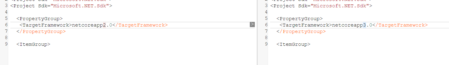 第一种是直接修改我们的项目文件 .csproj ,修改节点 <TargetFramework>netcoreapp3.0</TargetFramework>,并移除关于 Aspnetcore 2.2 相关的包;