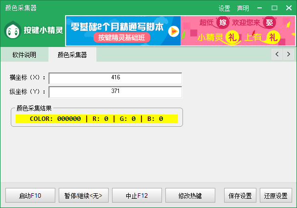 启动脚本后,程序会实时监测鼠标在屏幕上的坐标,并显示在txtAxisX和txtAxisY两个InputBox中,采集到的颜色数据,经加工后放在下方的黄色Label里。