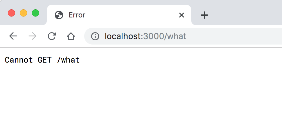 如果你打开服务器,访问一个不存在的路径,例如 localhost:3000/what,就会出现这样的页面: