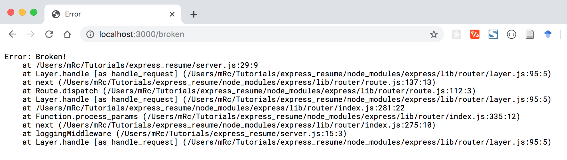 Express 已经自带了错误处理机制,我们先来体验一下。在 server.js 中添加下面这条”坏掉“的路由(模拟现实中出错的情形):