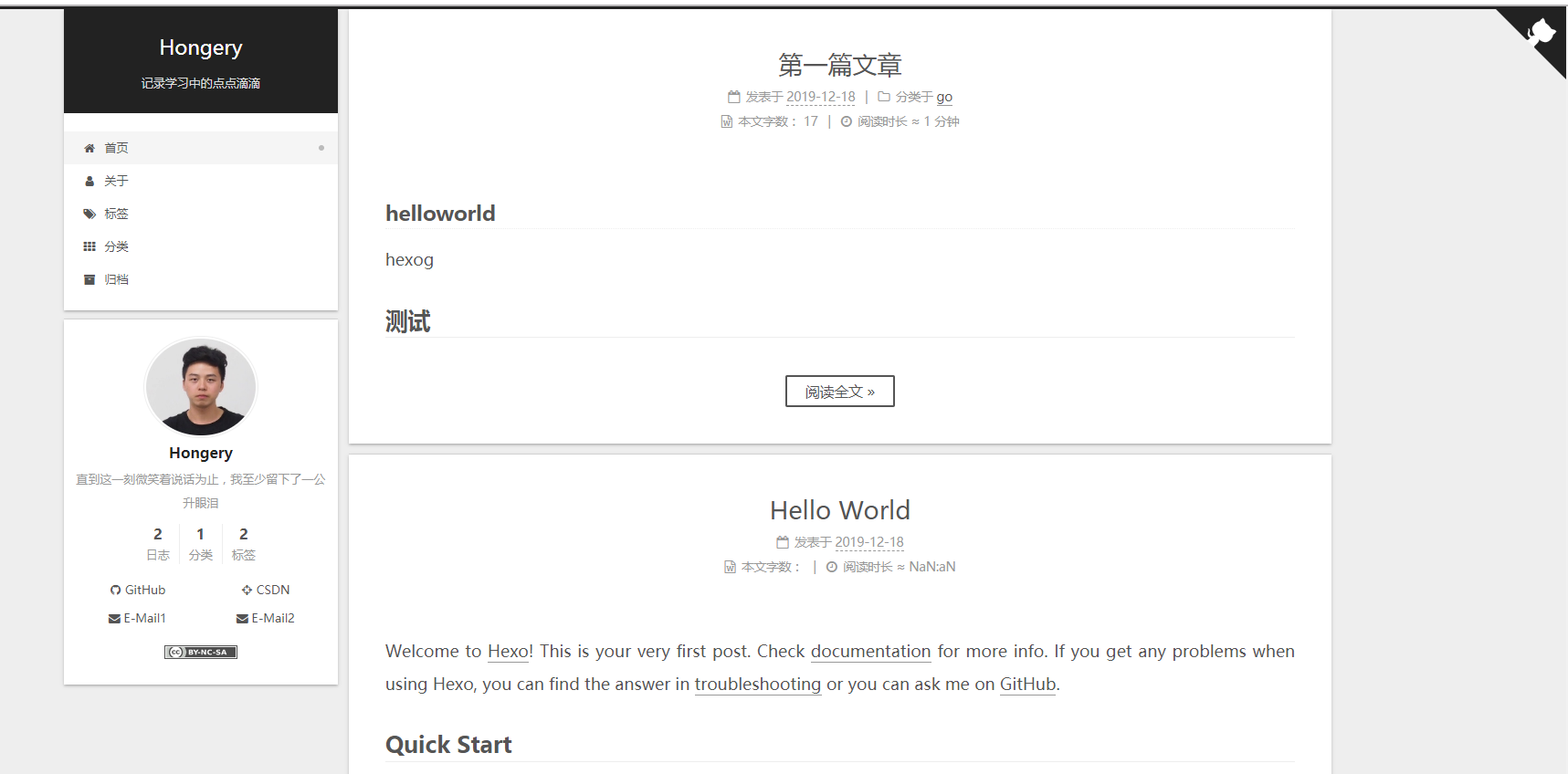 以下是我本地的预览效果,更换了 next 主题的,默认不是这个主题。