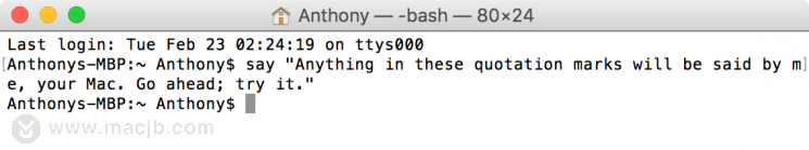 结果应该是您的Mac在说:“我的Mac,我会说这些引号中的任何内容。前进; 请使用您在本教程前面选择的声音尝试一下。如果您没有听到任何声音,请检查以确保您的音量已调高并且命令输入正确。