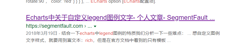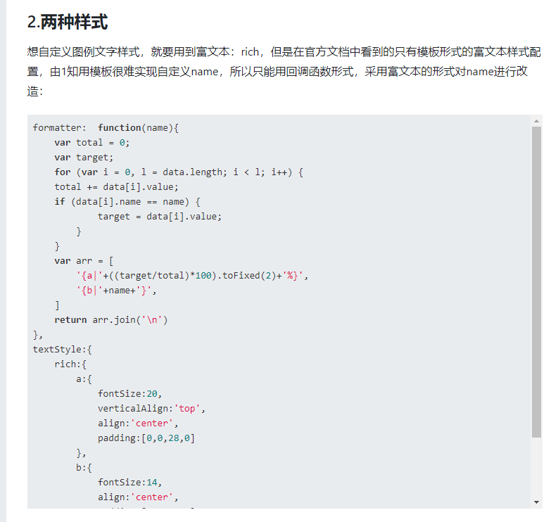 让我想想当时发生了什么……当时我找到了rich这个配置项,真当我打算试一试的时候,却发现demo代码跟我的想象有点不太一样——代码由label包围了起来,而不是我想象中的legend,于是我就认为,直接这样搬过来,肯定会用不了,代码里连legend关键字都没有。但此时还是怀有一些希望,于是我就转而去 搜索了一下关键字【echarts legend rich】 ,找到了一篇看起来匹配的文章