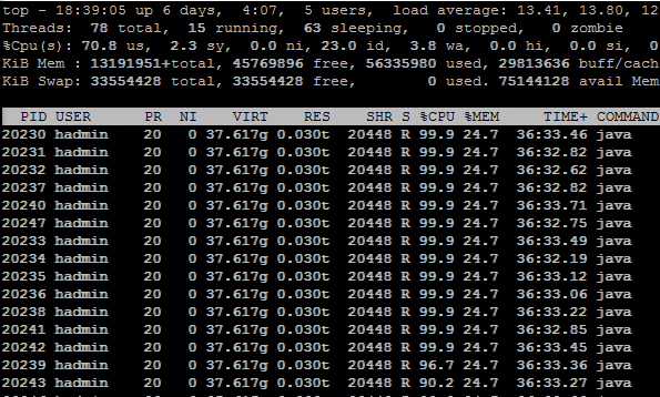 是不是很震撼,基本上所有的cpu都快满负荷运行了,这些肯定不是正常的java进程