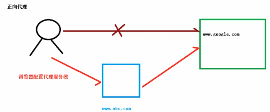 在客户端(浏览器)配置代理服务器,通过代理服务器进行互联网访问(正向代理代理的是客户端,服务器不知道实际的客户端是谁)