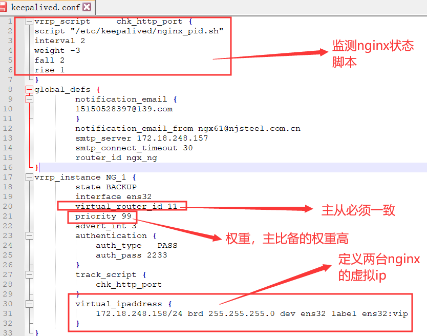 在两台机器上安装nginx和keepalived,配置keepalived的配置文件keepalived.conf