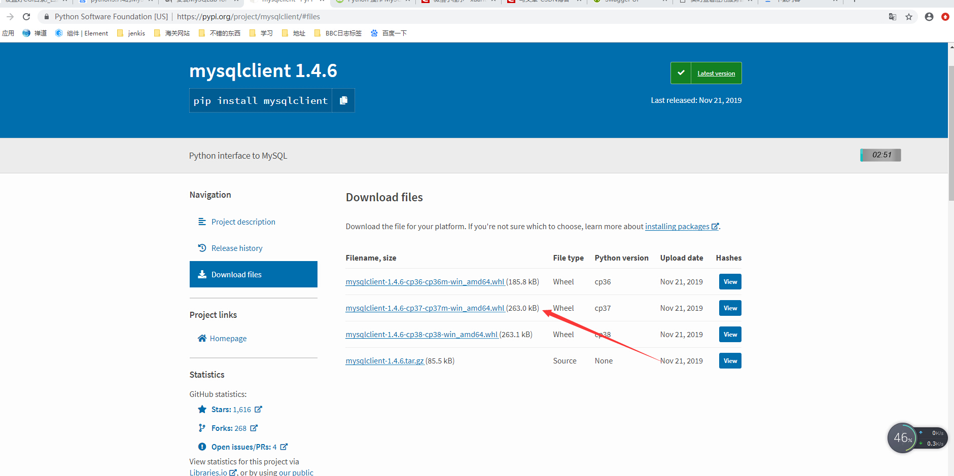 因我的Python的版本是3.7,所以选择网页中mysqlclient-1.4.6-cp37-cp37m-win_amd64.whl ,带有37字样的版本