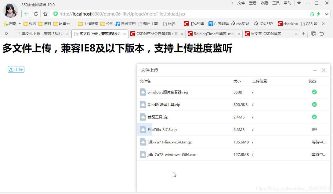 <h1>多文件上传,兼容IE8及以下版本,支持上传进度监听</h1>
