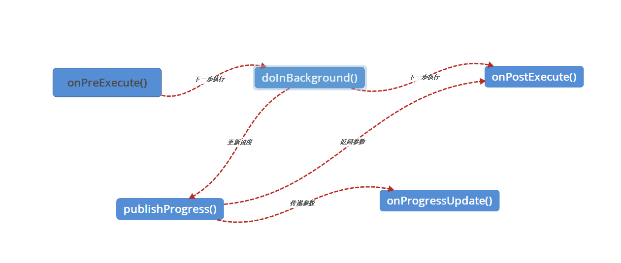onPreExecute(),异步执行之前,此方法被调用做一些准备工作。doInBackground()在线程池中执行,此方法用于执行异步任务。doInBackground()在线程池中执行,此方法用于执行异步任务,执行过程中可以调用publishProgress()方法更新任务执行进度。onProgressUpdate()方法在主线程中执行,每次任务进度更新时被调用。onPostExecute()在任务执行完成时被调用,其参数为doInBackground()的返回参数。