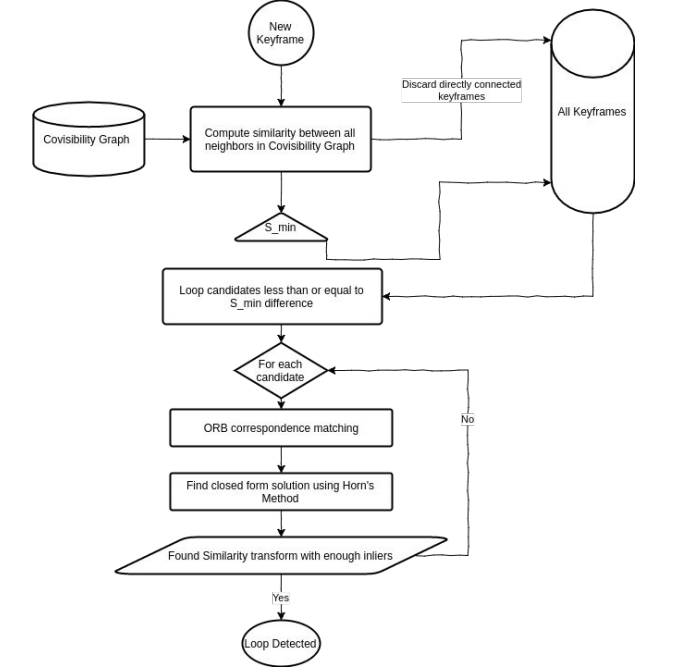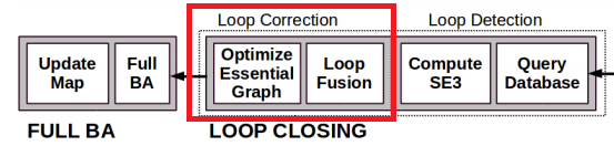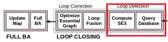 当机器人的轨迹完成一个环的时候,称为Loop closure。Loop closing线程需要首先检测到闭环事件,之后优化Pose Graph,启动全局BA线程,优化整个地图和关键帧。