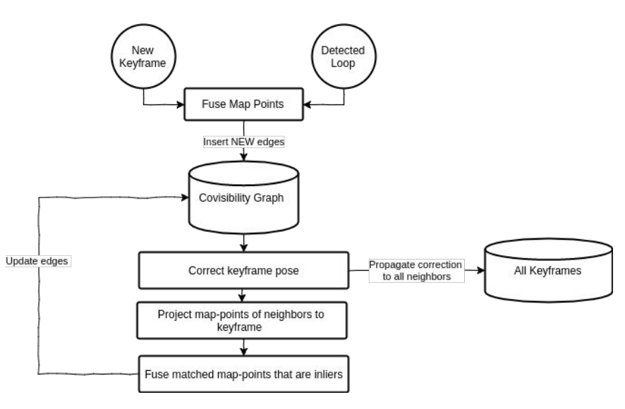 - 融合新插入的关键帧与Loop,在Covisibility Graph中建立新的边。