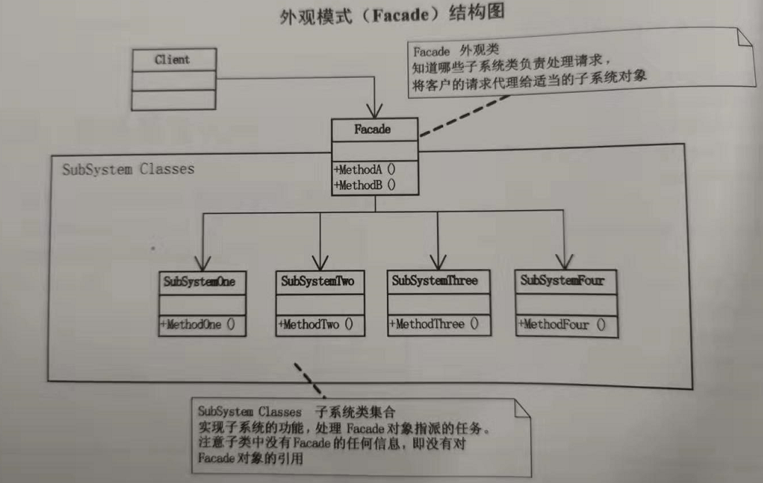 其中外观类需要了解所有子系统的方法或属性,对它进行组合,以备外界调用。