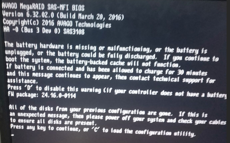 华为RH5885服务器开机停止在The battery hardware is missing or malfunctioning,or battery is unplugged,or the battery could be fully discharged.....