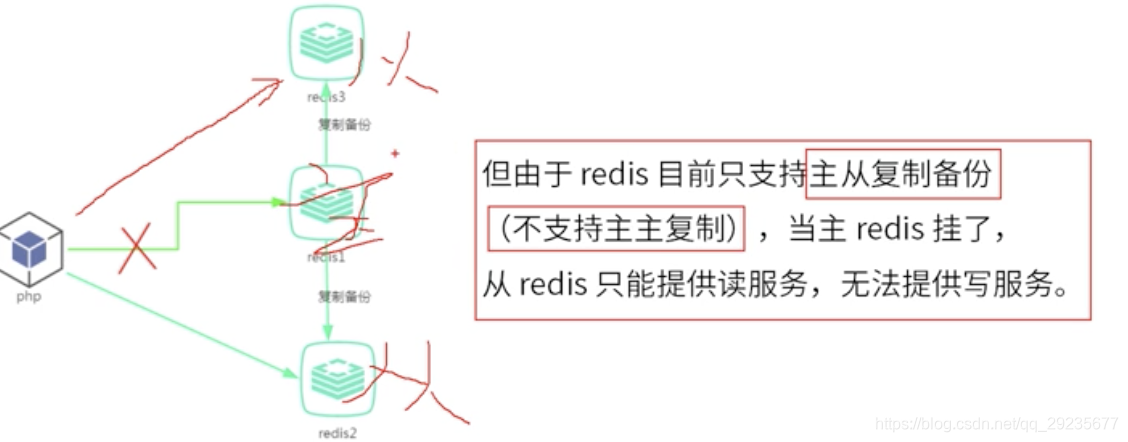 解决方案:将从服务器在主挂掉之后,提升成主服务。(本身不能主动支持,要手动将从----变成主服务)