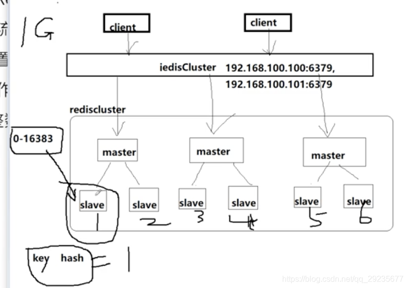 1G的数据,key 根据hash槽 (0-16383个槽节点redi实例)下图1-6个槽,进行hash运算之后,得到1,之后只会将1G的数据写到对应的槽当中去,减少内存资源的损耗。(之前是1G* N个节点)