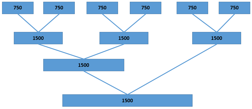 每个归并段的大小是750个记录,记住,这些归并段已经全部写到临时缓冲区(由一个可用的磁盘充当)内了,这是第一步的排序结果。