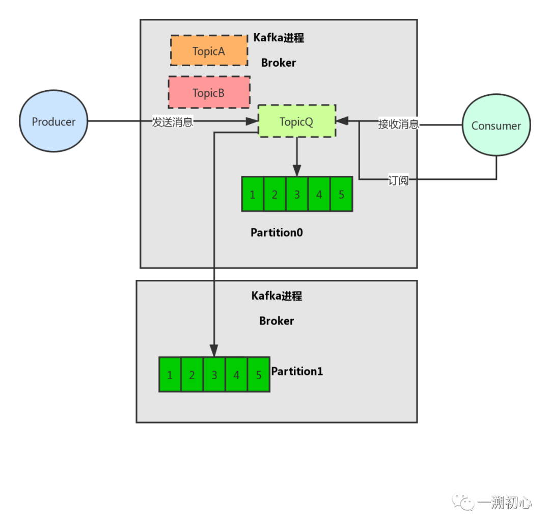 Partition,分区,数据分区,数据分片,这是物理存储上的分组,每一个Topic可能对应多个分片,比如Topic为Order的消息需要存放5TB的数据到磁盘,如果分配5个Partition,每个partition就是1TB的数据。