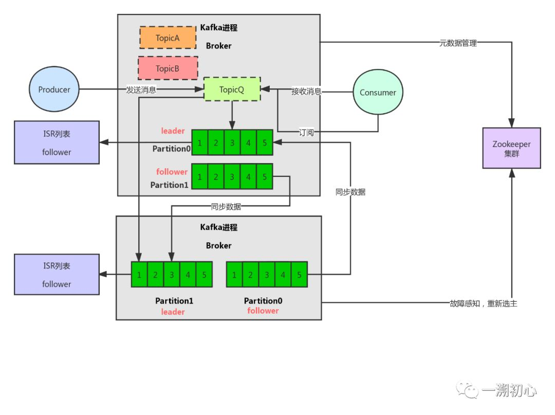 假设此时leader partition宕机了,zookeeper会感知到,并且会在kafka集群选举出新的leader partition提供服务,新的leader partition拥有之前同步到的所有数据,通过这样的多副本冗余机制加上主从模式,宕机选主,就可以实现高可用啦。