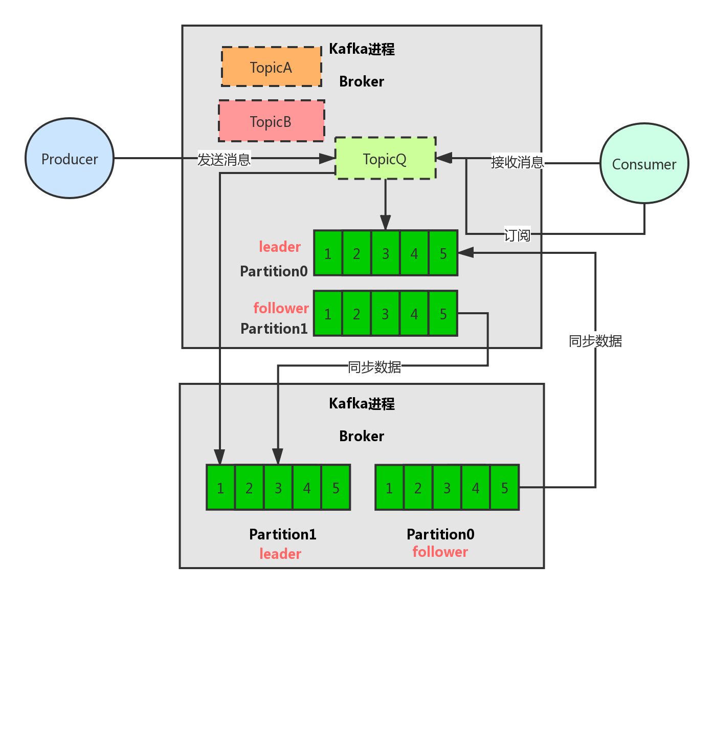 并且,将每个Partition的副本都是放到其他机器上,假设一个Partition有三个副本,kafka还会借助zookeeper选举出一个leader Partition,这个leader partition就是这个partition负责对外提供读写的服务。其他的follower partition 会定时同步数据。