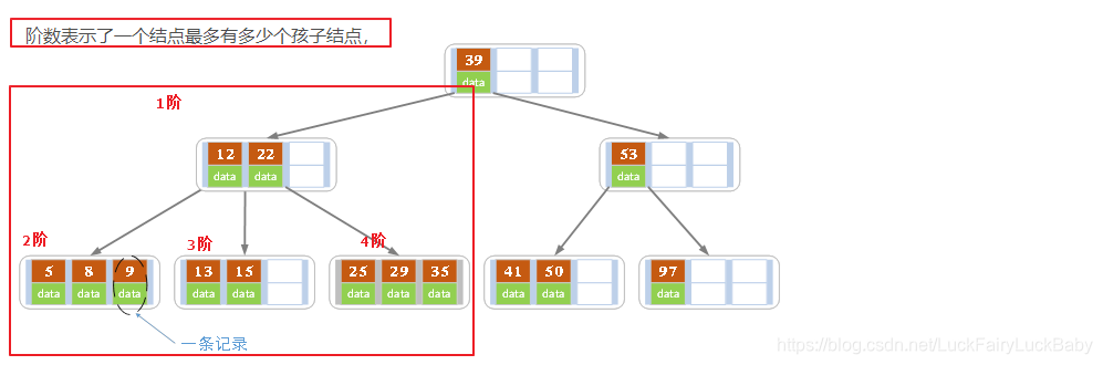 B树也称B-树,它是一颗多路平衡查找树。我们描述一颗B树时需要指定它的阶数,阶数表示了一个结点最多有多少个孩子结点,一般用字母m表示阶数。当m取2时,就是我们常见的二叉搜索树。