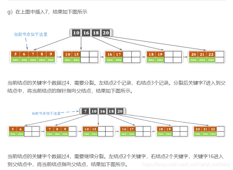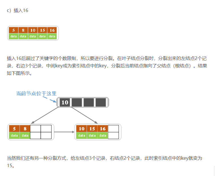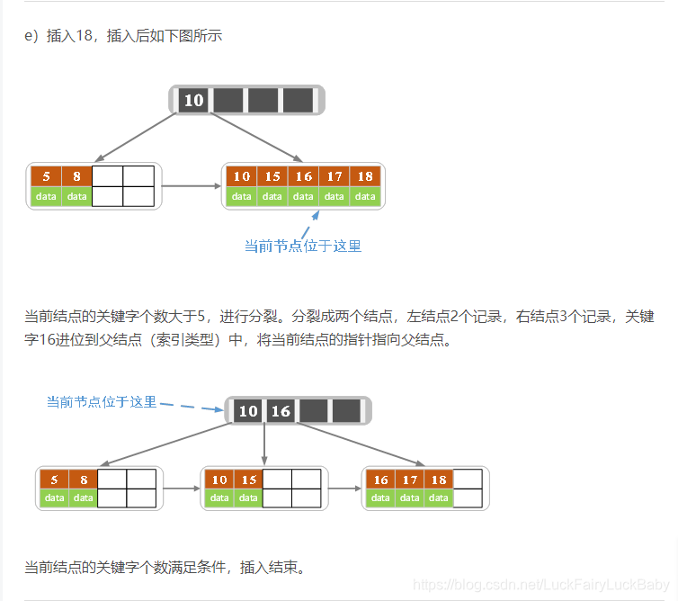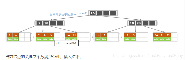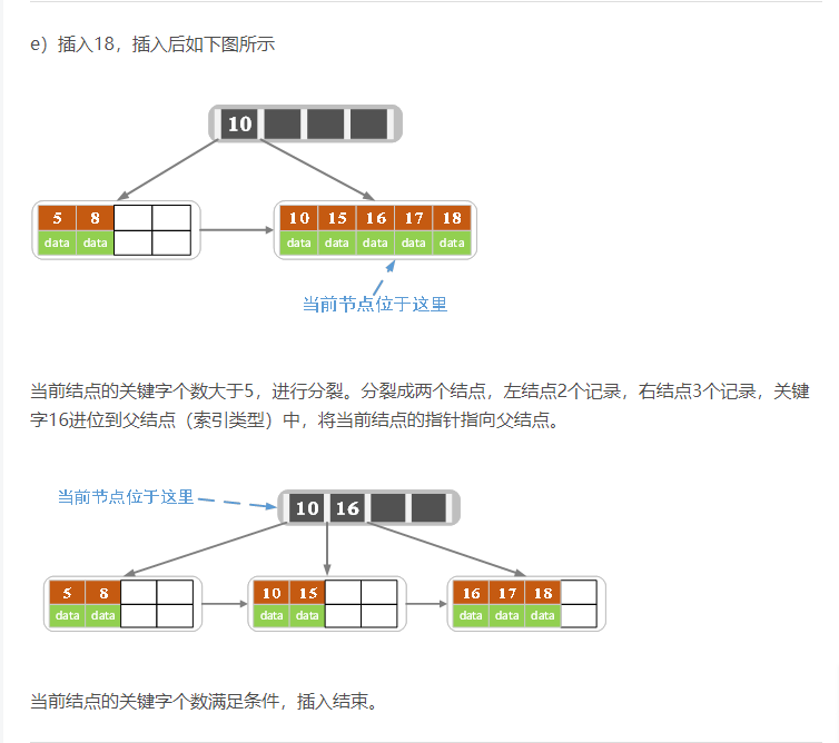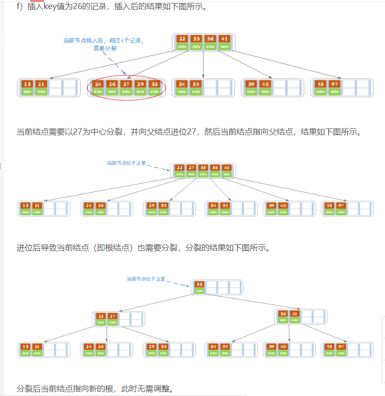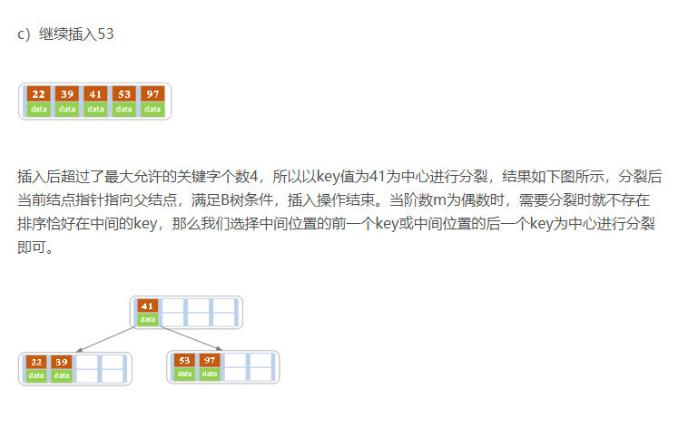 - 针对索引类型结点:若当前结点key的个数小于等于m-1,则插入结束。否则,将这个索引类型结点分裂成两个索引结点,左索引结点包含前(m-1)/2个key,右结点包含m-(m-1)/2个key,将第m/2个key进位到父结点中,进位到父结点的key左孩子指向左结点, 进位到父结点的key右孩子指向右结点。将当前结点的指针指向父结点,然后重复第3步