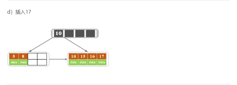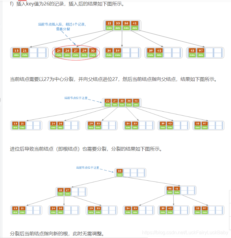 - 针对叶子类型结点:根据key值找到叶子结点,向这个叶子结点插入记录。插入后,若当前结点key的个数小于等于m-1,则插入结束。否则将这个叶子结点分裂成左右两个叶子结点,左叶子结点包含前m/2个记录,右结点包含剩下的记录,将第m/2+1个记录的key进位到父结点中(父结点一定是索引类型结点),进位到父结点的key左孩子指针向左结点,右孩子指针向右结点。将当前结点的指针指向父结点,然后执行第3步。