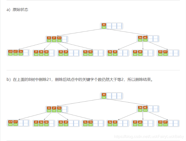 下面是一颗5阶B树的删除过程,5阶B数的结点最少2个key,最多4个key。