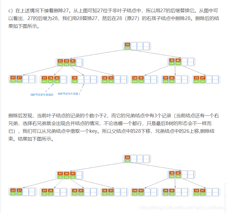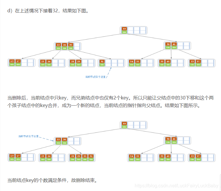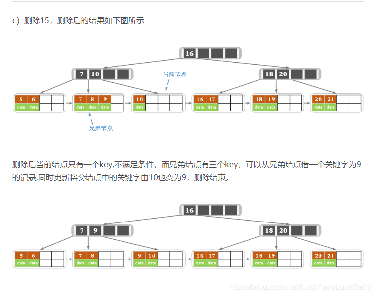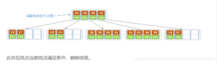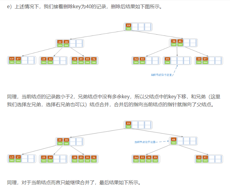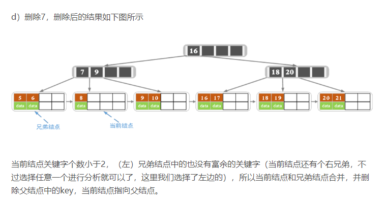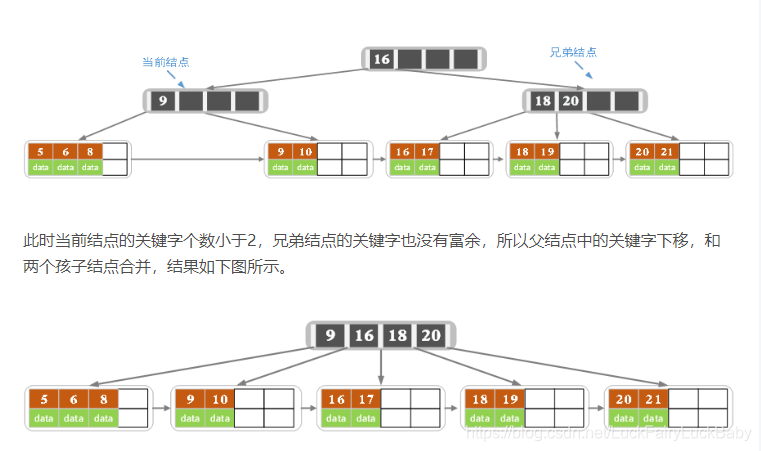 - 若兄弟结点中没有富余的key,则当前结点和兄弟结点合并成一个新的叶子结点,并删除父结点中的key(父结点中的这个key两边的孩子指针就变成了一个指针,正好指向这个新的叶子结点),将当前结点指向父结点(必为索引结点),执行第4步(第4步以后的操作和B树就完全一样了,主要是为了更新索引结点)。