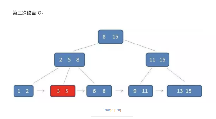 在单元查询的时候,B+树会自定向下逐层查找,最终找到匹配的叶子节点。例如我们查找3 。