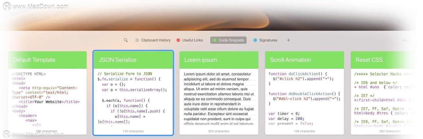 一款编程文档管理工具,可以浏览API文档,以及管理代码片段工具。Dash for Mac自带了丰富的API文档,涉及各种主流的编程语言和框架。用户可以把日常使用频繁的代码保存起来,让学习各种编程语言不再是难事!