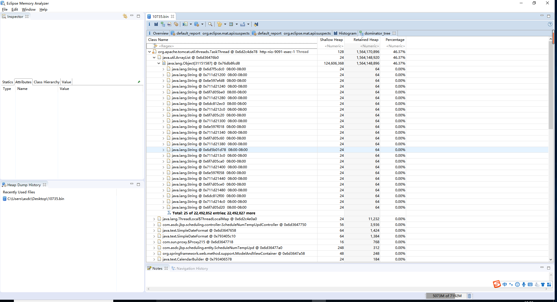 8.先用dominator_tree看了下哪些线程占用空间大 ,我这发现 有4个线程占用了几乎99%的内存。然后打开发现里面有个arraylist存了2千万数据,这不gg?