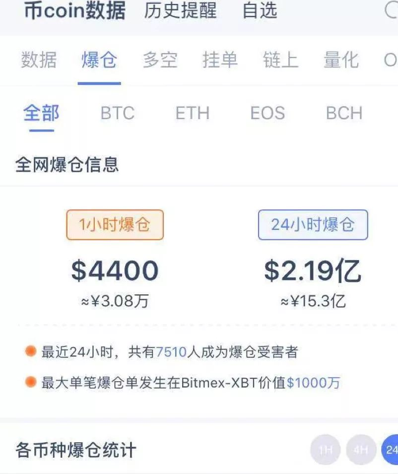 先跌后涨的极端行情坑苦了合约用户。一夜时间,做多、做空的用户都遭遇了爆仓险情。据合约数据网站币Coin显示,截至19日下午两点,24小时内共有超7500个用户被爆仓;爆仓金额达2.19亿美元,其中比特币占1.83亿美元,以太坊为1800万美元。
