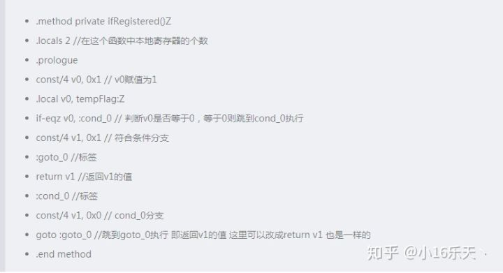 我们来分析一下上面的两句 smali 代码,首先它使用了 v0 本地寄存器,并把值 0x1 存到 v0 中,然后第二句用 iput-boolean 这个指令把 v0 中的值存放到 com.aaa.IsRegistered 这个成员变量中。