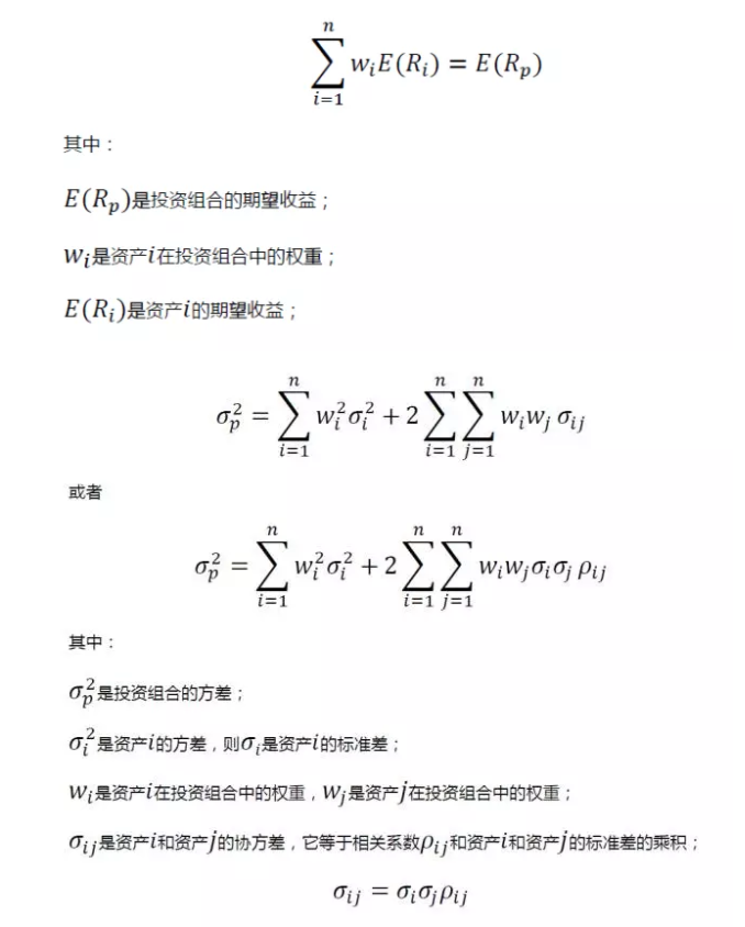 现代投资组合理论用均值和方差来刻画收益和风险这两个关键因素。均值,指的是投资组合的期望收益率,它是单只证券的期望收益率的加权平均,权重为相应的投资比例。而方差,则是指投资组合的收益率的方差,它衡量了实际收益率和均值的背离,刻画了投资组合的风险。用公式表示就是: