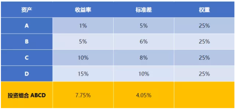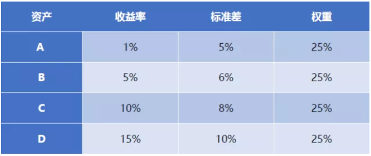 假设目前市场上有四种资产ABCD,根据它们在过去一年中的表现,我们计算得到它们的年化收益率、标准差分别如下。我们打算将它们等权重持有,也就是每种资产占投资组合的25%: