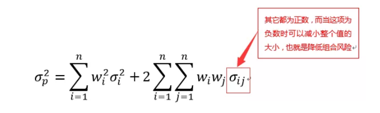 通过公式我们也可以看出来,当协方差为负数时,是可以减小组合的方差的!