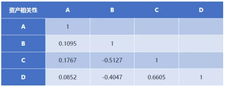 回到我们例子中投资组合的方差的计算,假设各种资产之间的相关系数如下: