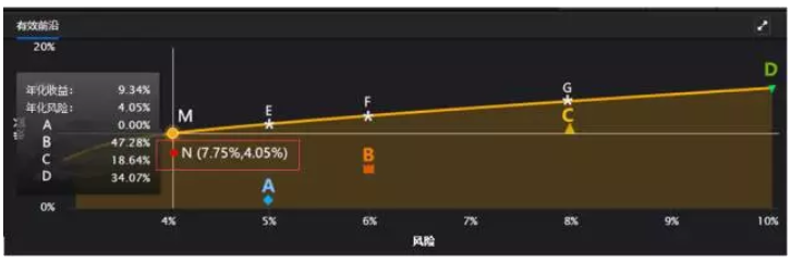 回到我们前面假设的等权重持有四种资产的组合的例子,这样的配置真的是最好的吗?答案是:非也。还记得等权重持有四种资产的组合收益和风险分别是7.75%和4.05%,对应的是图上的N点,然而我们可以在有效前沿上找到更好的一点M,在相同的风险水平(4.05%)的情况下,它的收益是9.34%(>7.75%)。那么组合M的配置是怎样的呢?我们可以得到A:0%,B:47.28%,C:18.64%,D:34.07%。