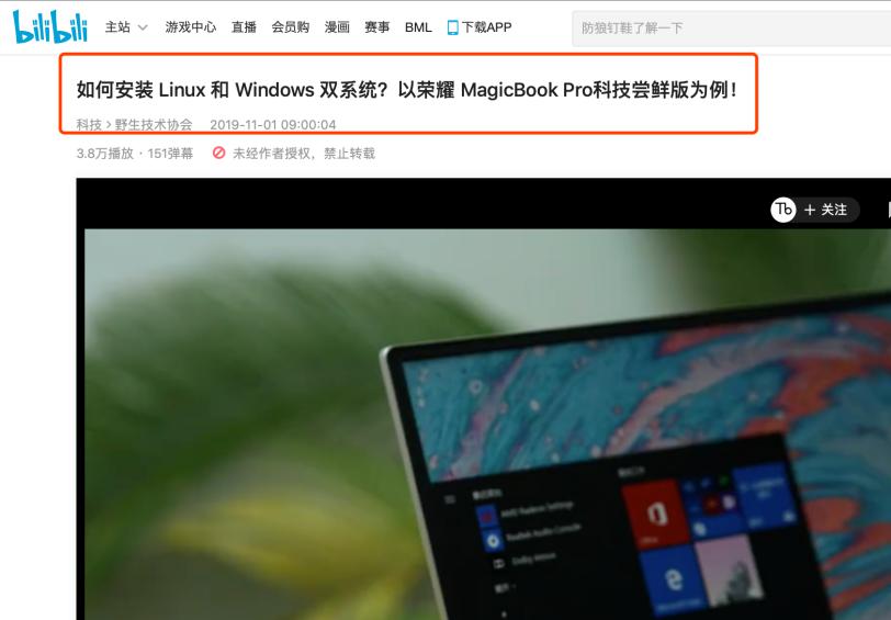 如果觉得自己下载比较麻烦,大家也可以去B站上搜索下面这个视频,视频底下有着Windows系统包下载链接,里面包含了荣耀驱动和电脑管家,直接下载到U盘里面即可,下面开始安装Win10系统。