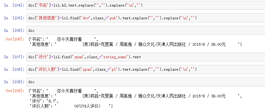 获取第一本书的书名、评分、评价人数以及作者、译者、出版社、出版日期等其他信息,并存到字典里
