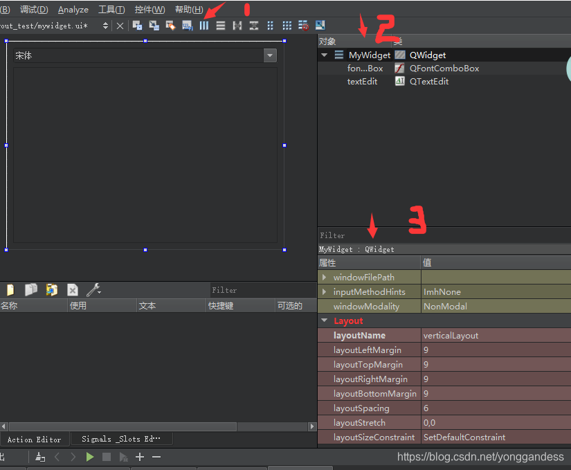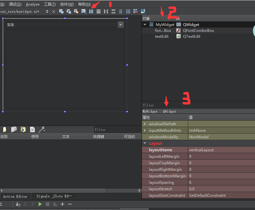 创建一个基于QWidget的项目,任意添加两个控件,然后点击主界面或者界面2的MyWidget,按ctrl+l或者按1的![]()