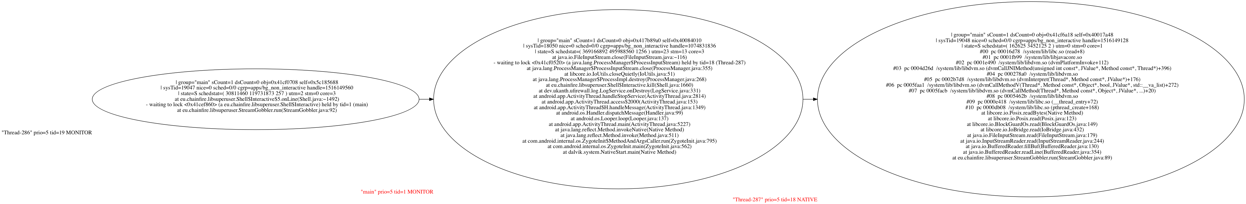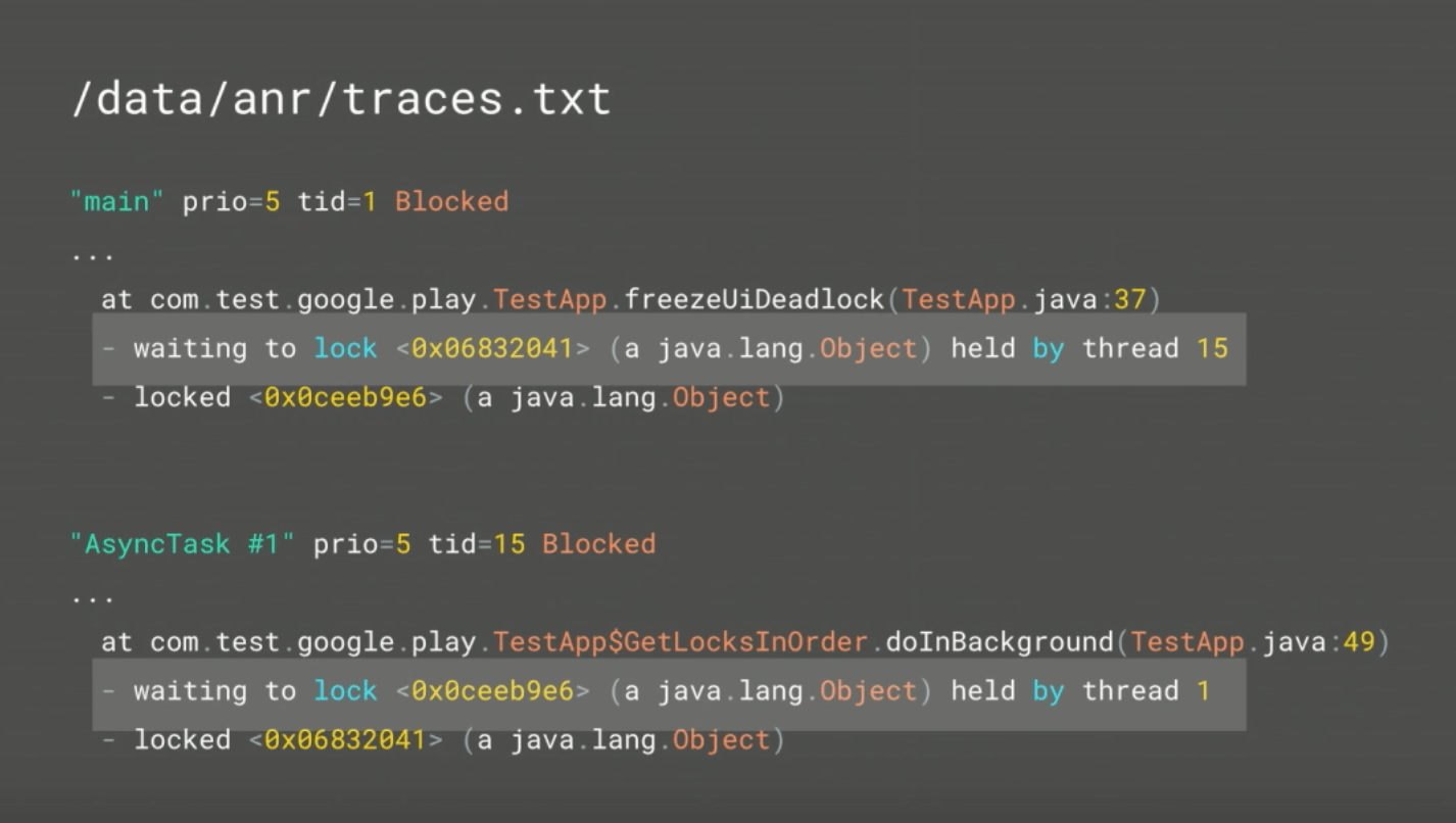 - example : waiting to lock <0xblahblah> (a com.foo.A) held by threadid=74