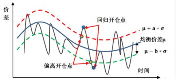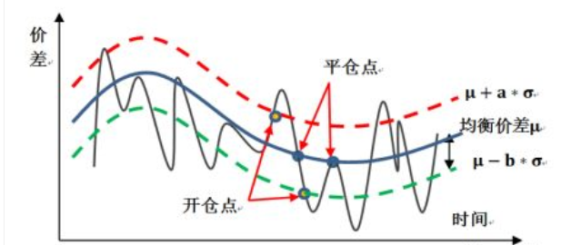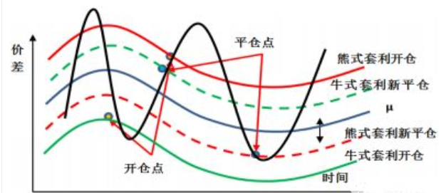具体的,用滞后一段时间的价差均线作为均衡价差,以均线加上若干倍的标准差作为开仓标准和止损标准,当价差偏离超过若干个标准差后策略开仓,而偏离更多时则止损。